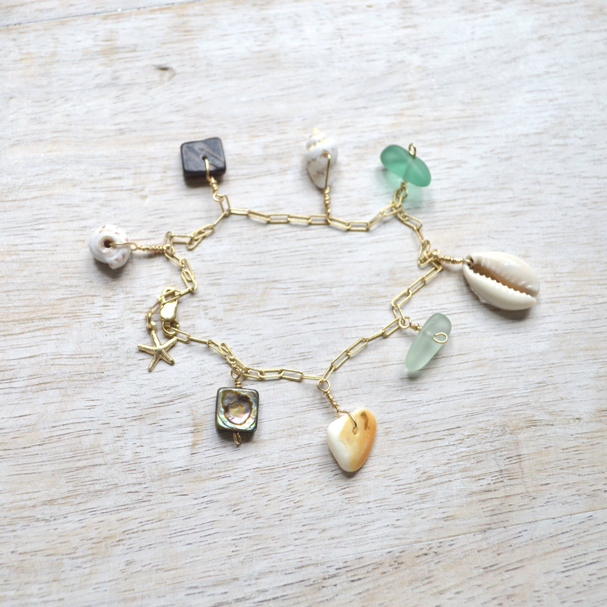 Assorted sea glass and shells dangle from an adjustable gold filled textured cable chain and finished with a tiny starfish at the end.