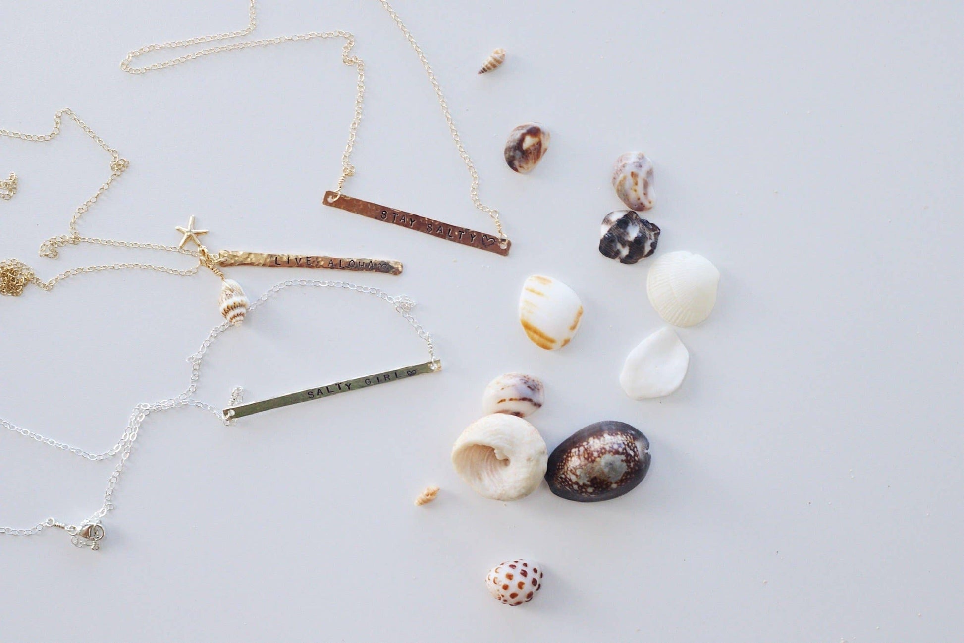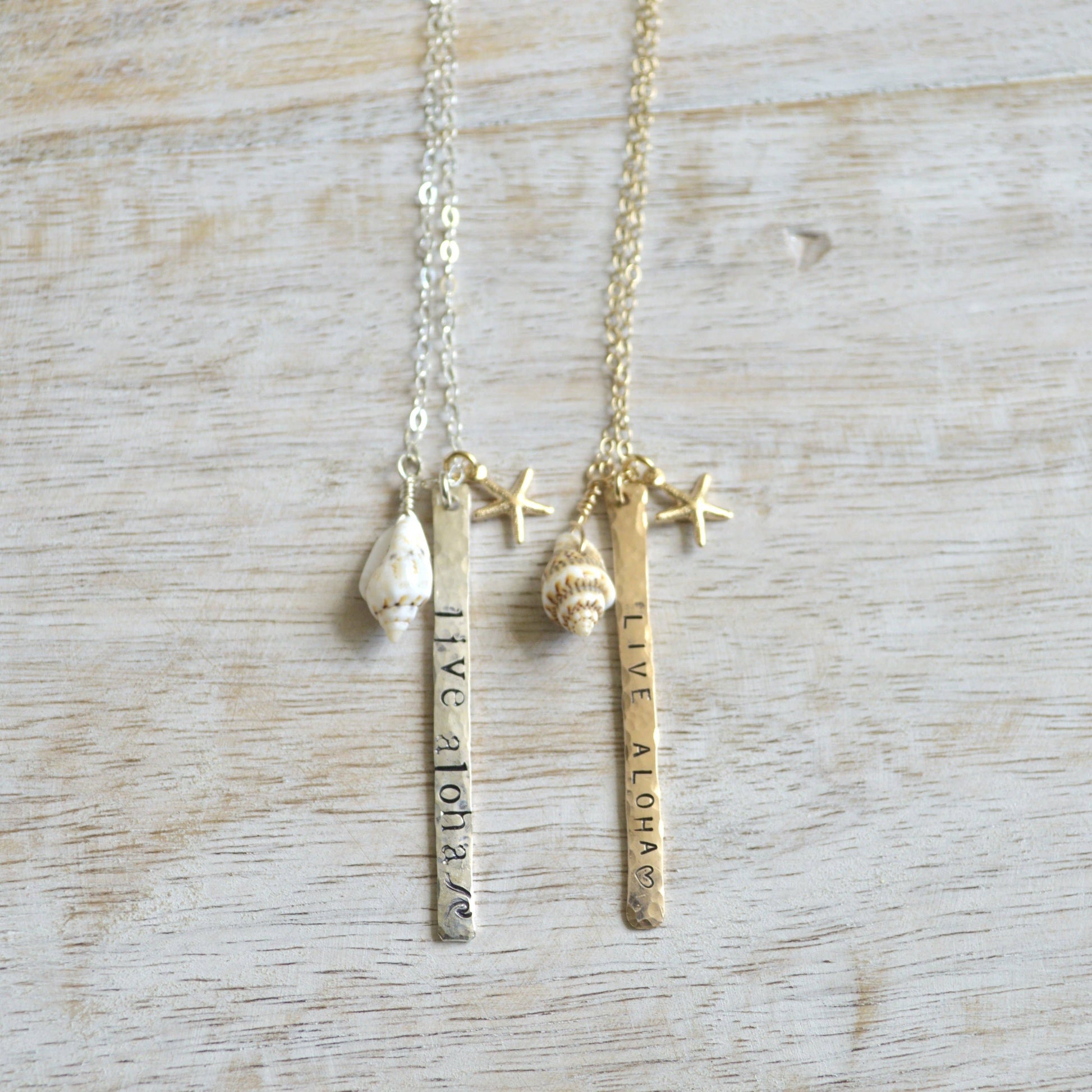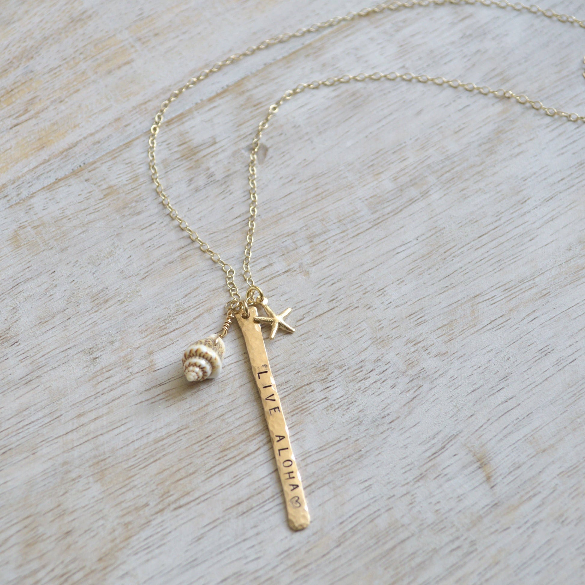 A reminder to "Live Aloha", this hand stamped vertical pendant necklace comes in either gold filled or sterling silver. It's accented with a tiny starfish and nassa shell.