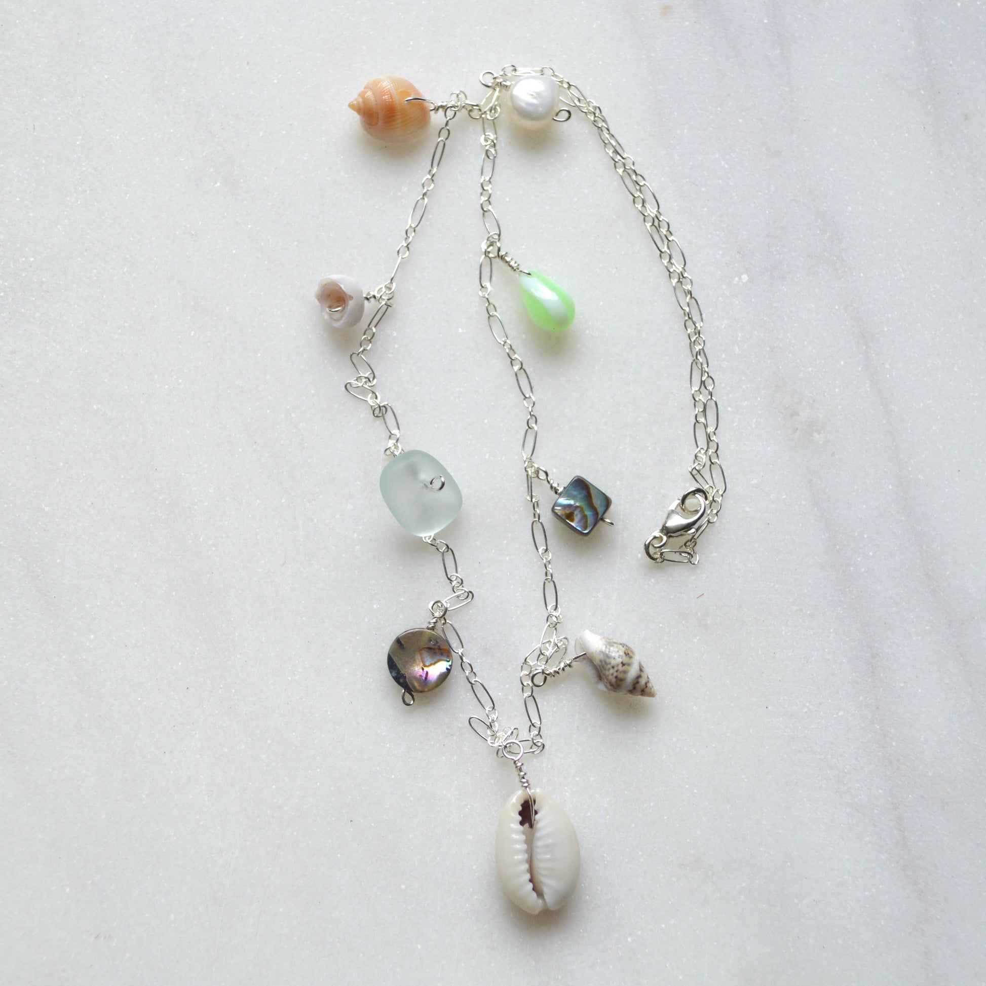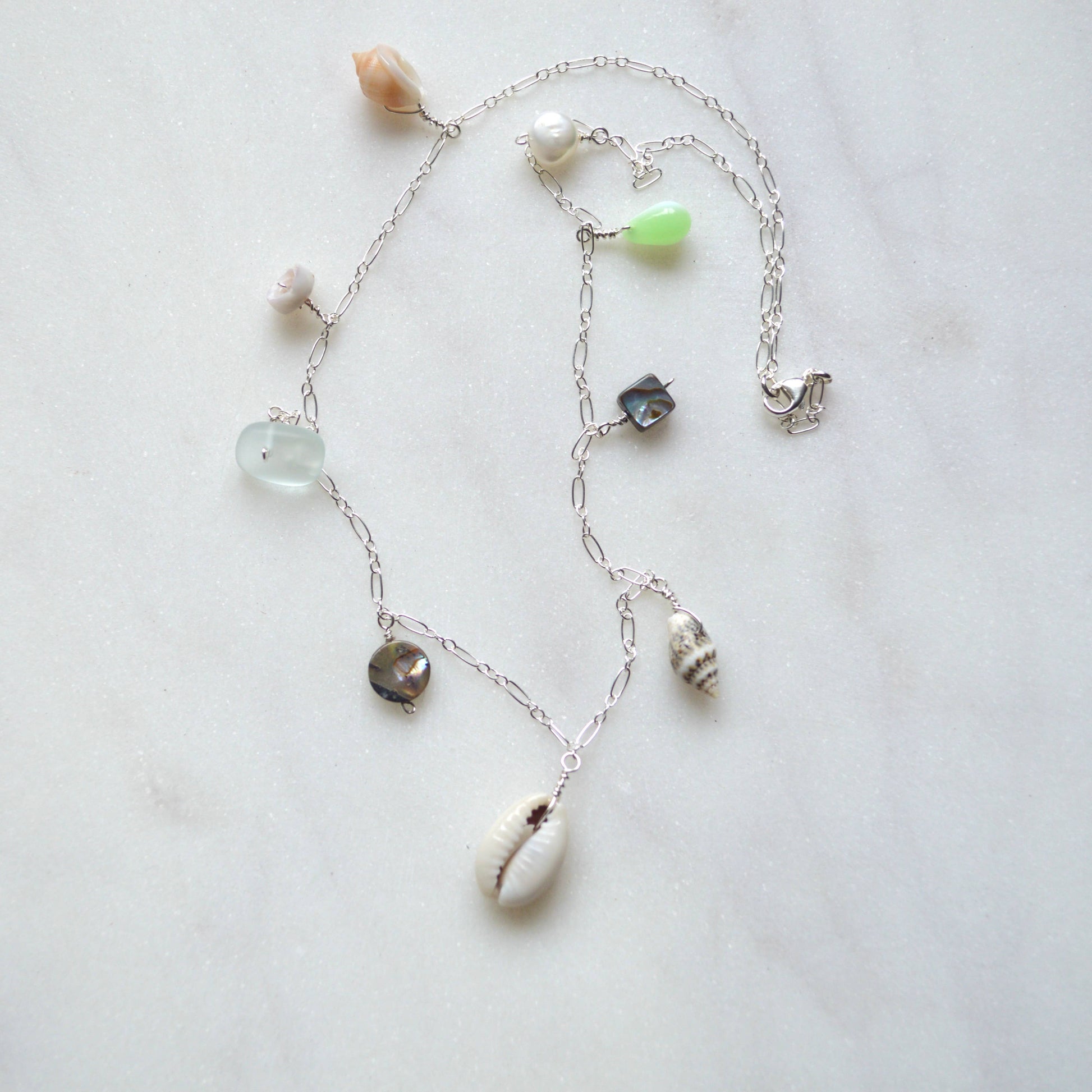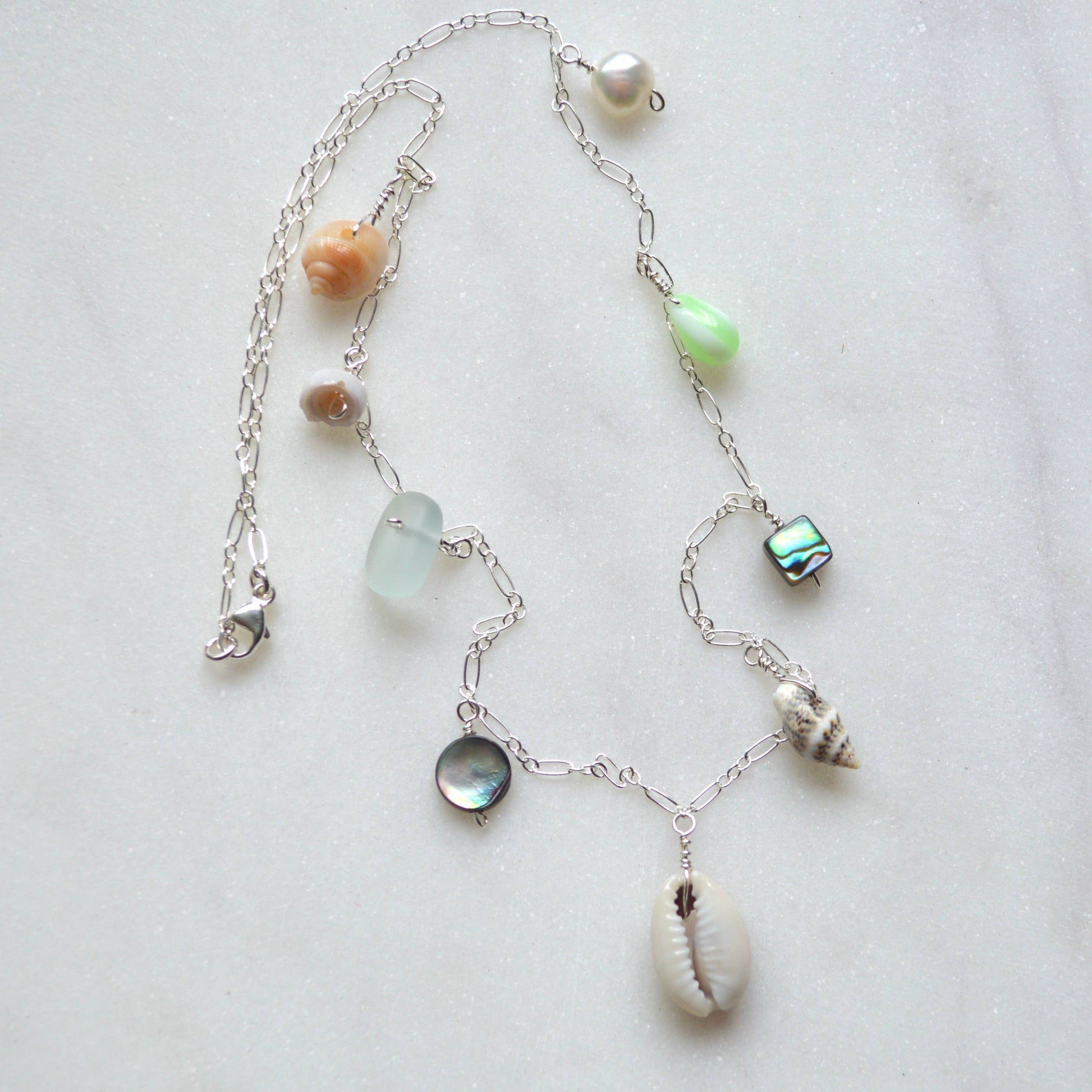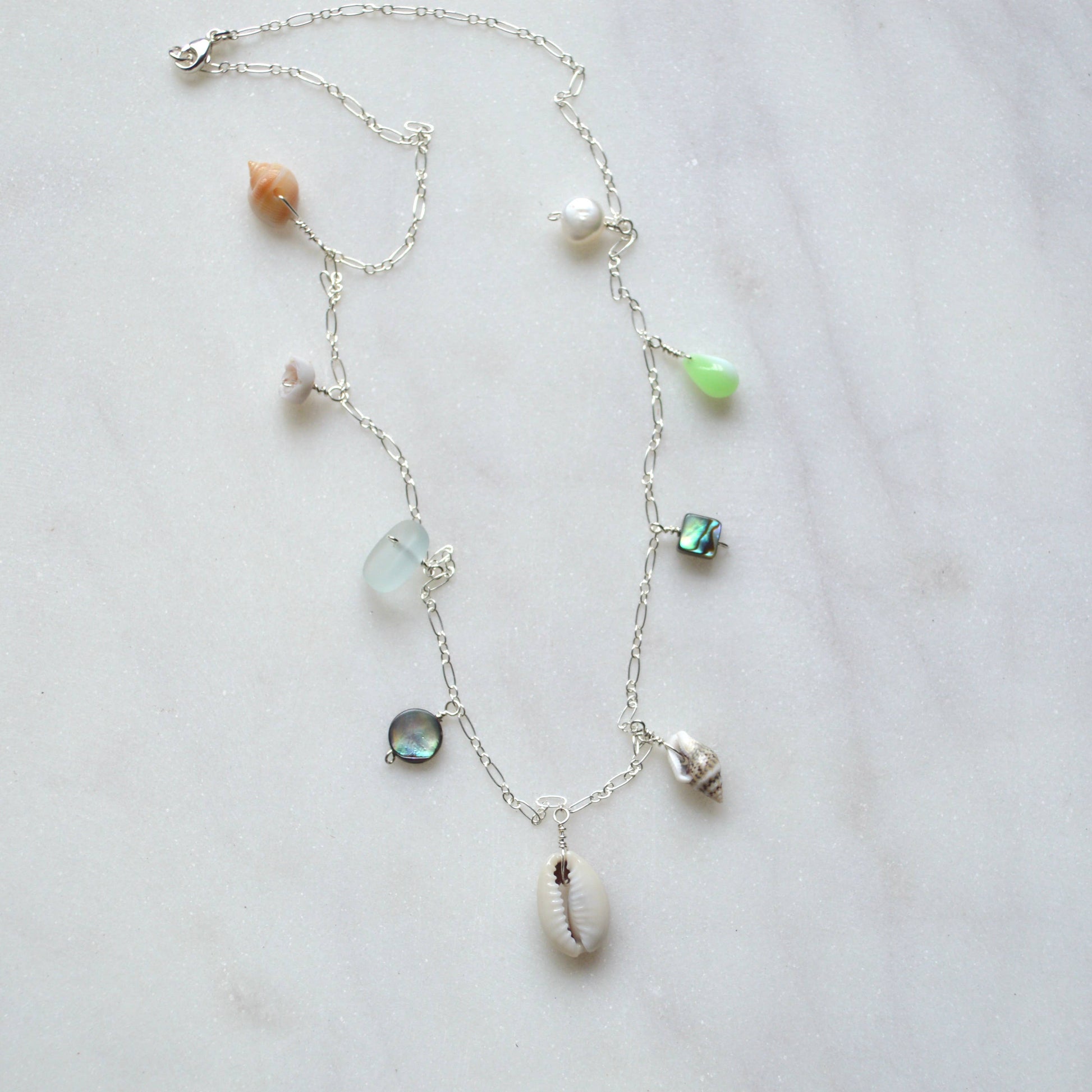 This beautiful ocean inspired necklace features a sliced cowrie shell in the center with various shells, a white pearl and frosted glass dangling from a sterling silver 1.9mm flat cable chain**